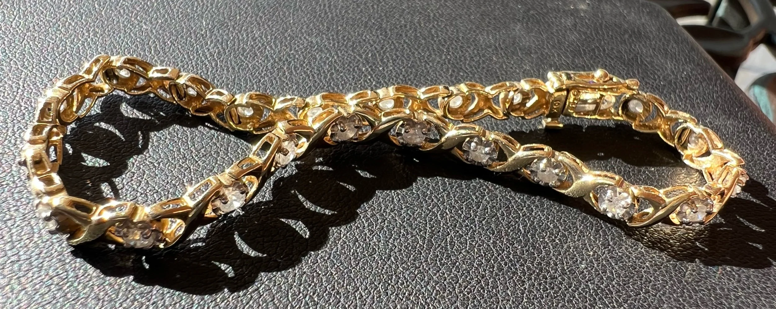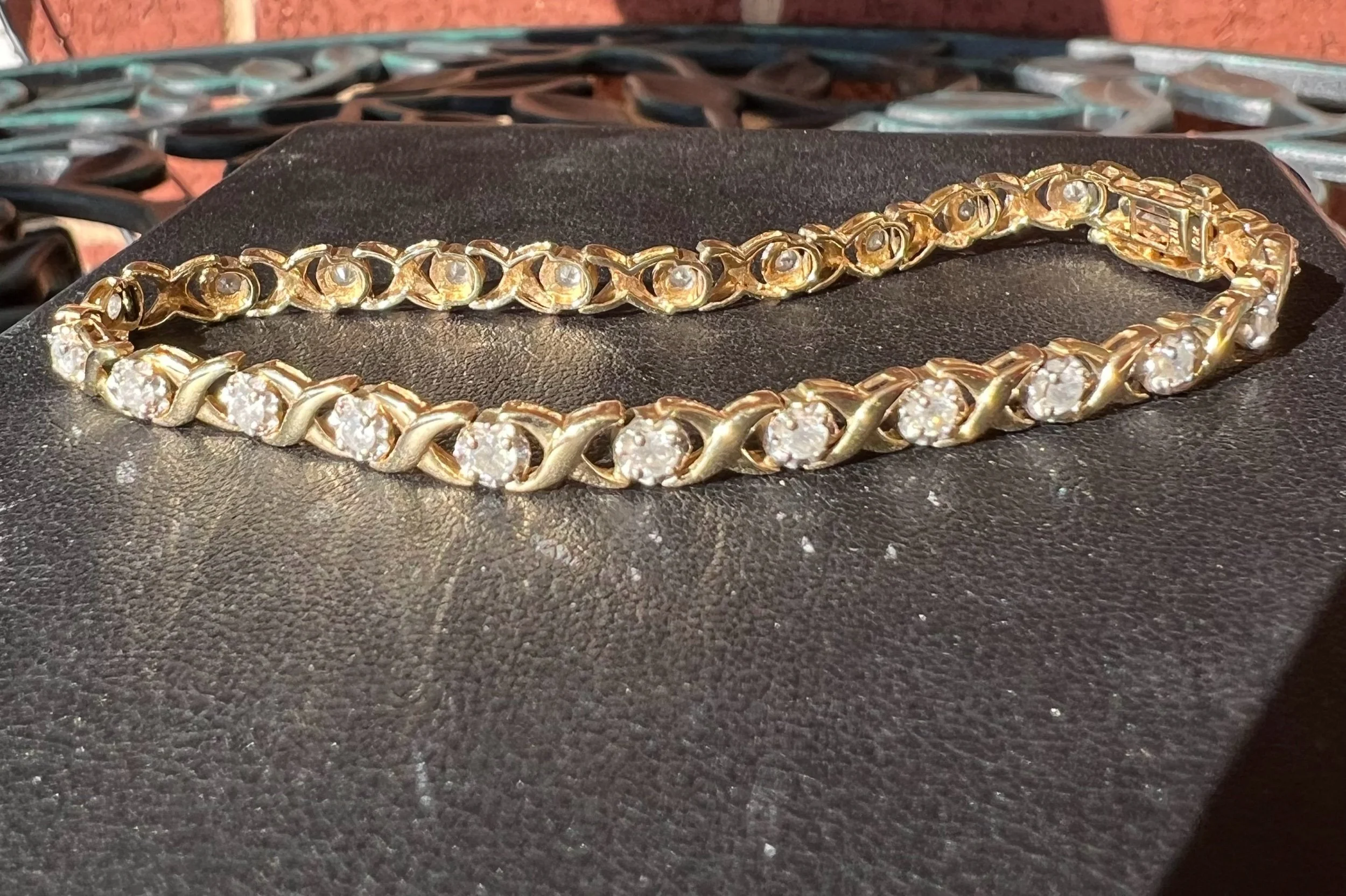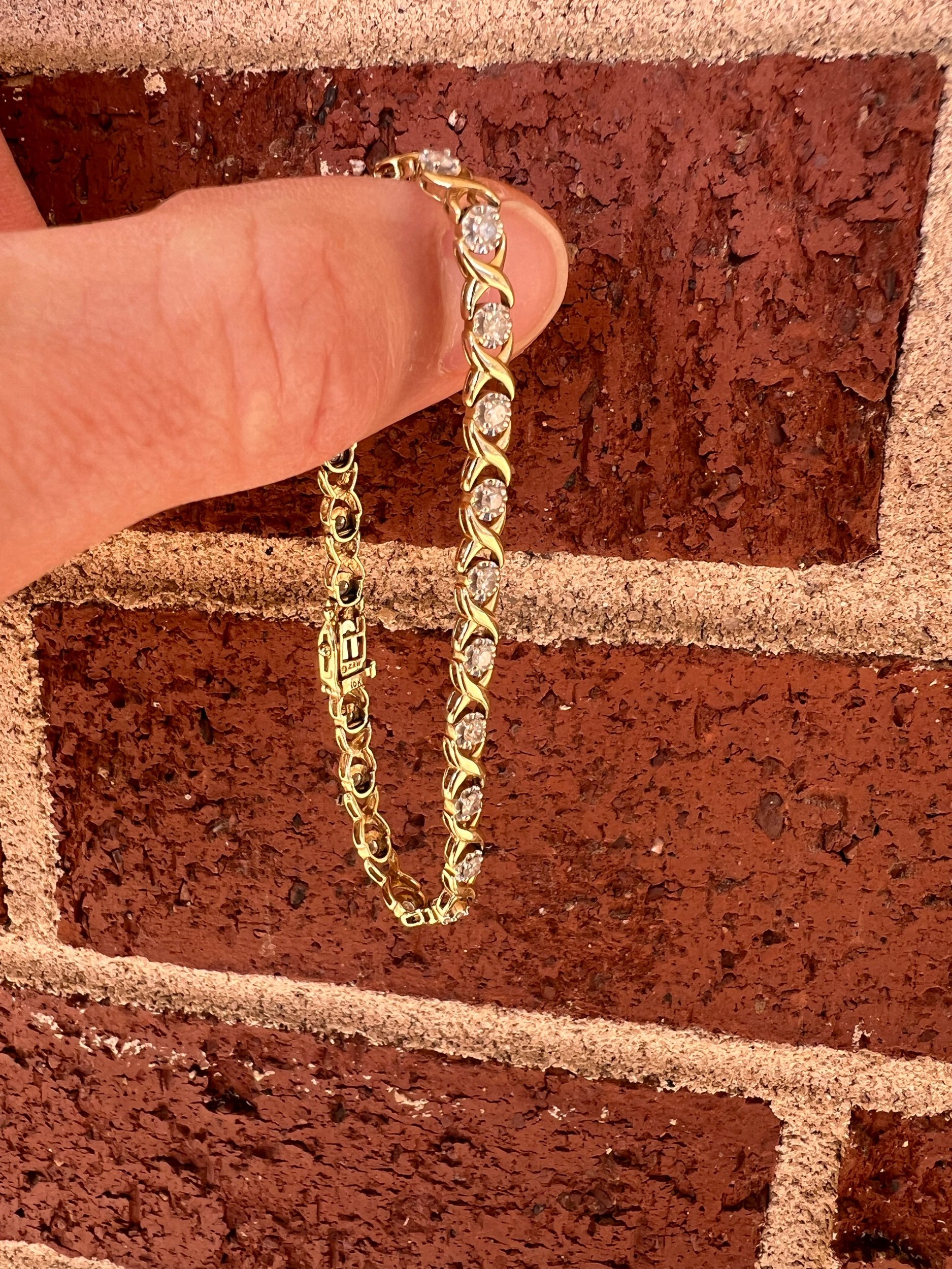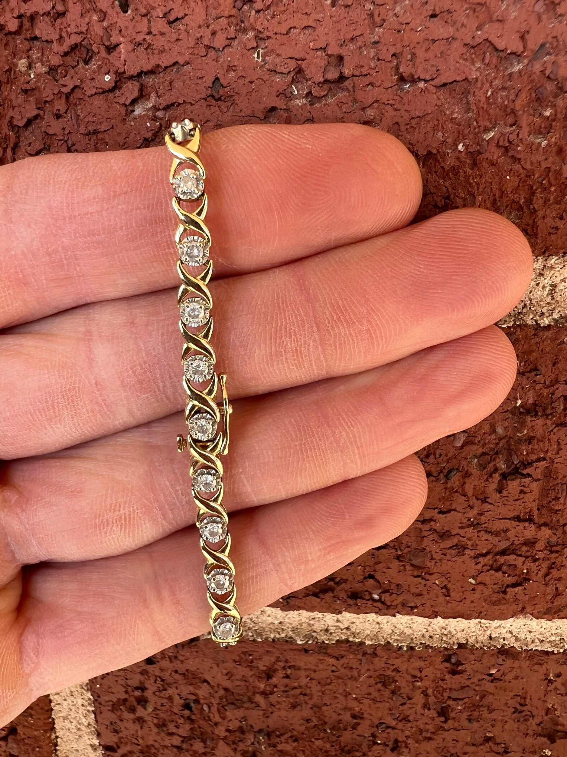 Image 1 of 5 Image 2 of 5 Image 3 of 5 Image 4 of 5 Image 5 of 5 10k 6.7g Diamond XO Bracelet 7" $575.00 Radiant gold XO bracelet sparkling with diamonds. 1 total carat diamond weight and I clarity. 4.7mm. Add To Cart Added! Radiant gold XO bracelet sparkling with diamonds. 1 total carat diamond weight and I clarity. 4.7mm. Reviews Reviewer Name Review Date Star Rating Description Posted on Etsy Product Show More