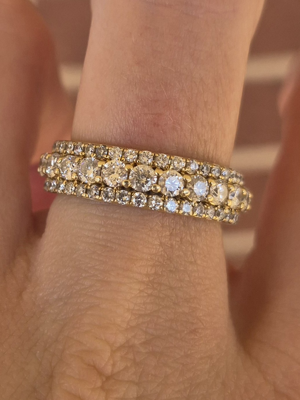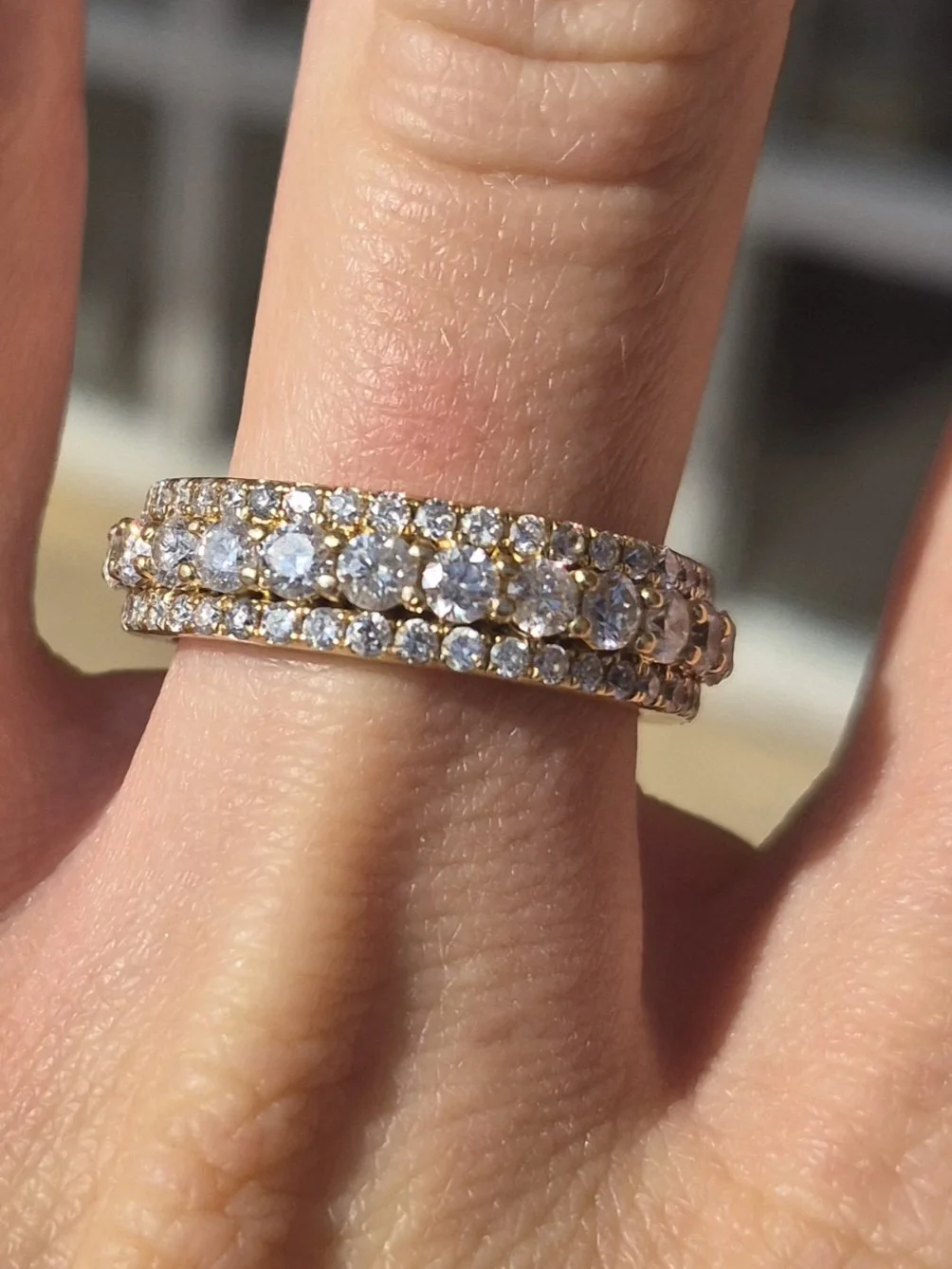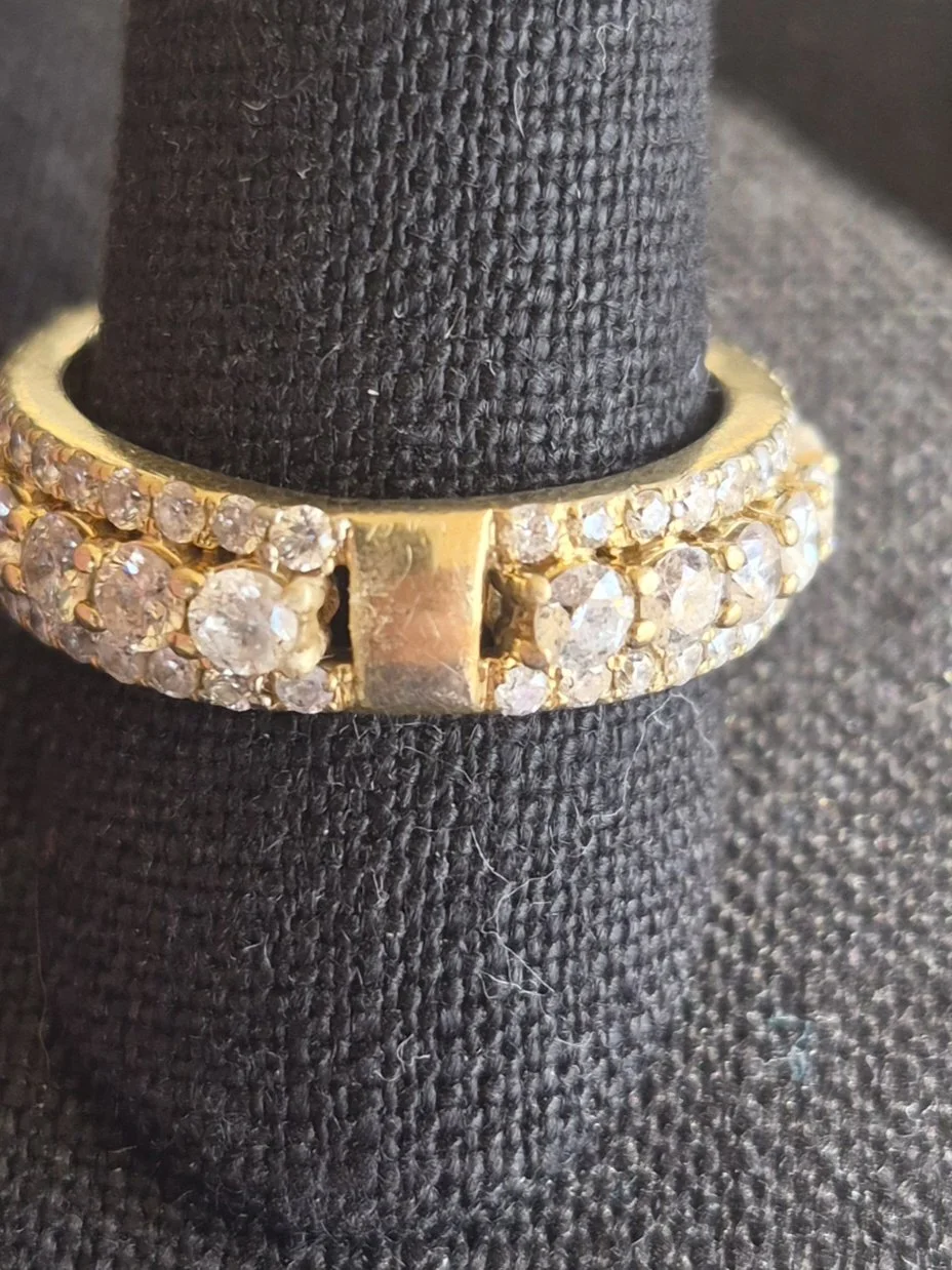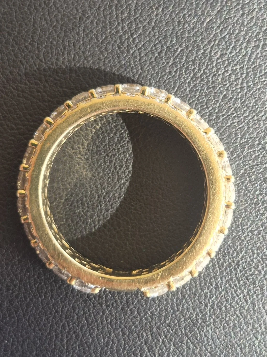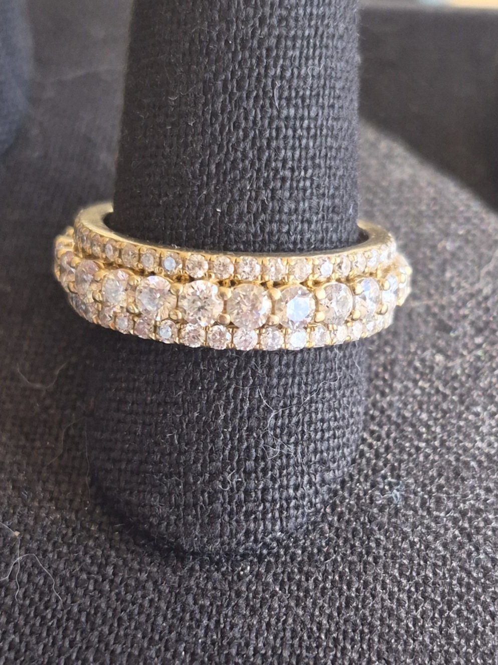Yellow gold band flooded with approximately 2tcw of natural diamonds. Diamonds wrap almost all the way around the ring except for a very small section for sizing.