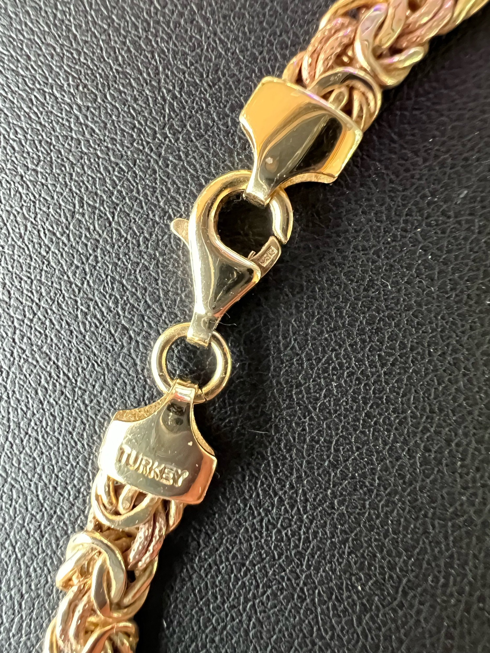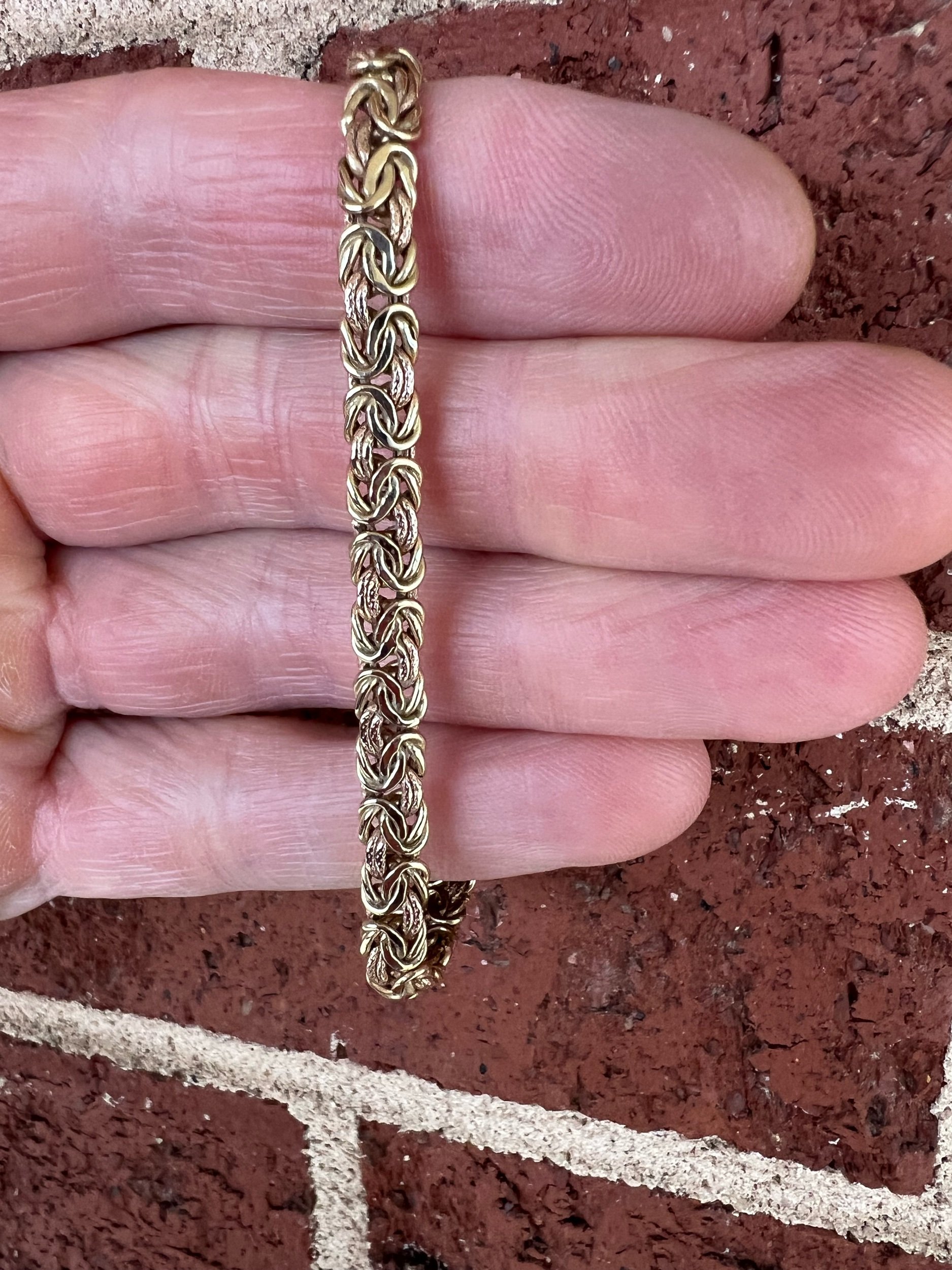Image 1 of 4 Image 2 of 4 Image 3 of 4 Image 4 of 4 14k Byzantine Bracelet 7g 7” $700.00 Intricate Byzantine gold bracelet showcasing timeless craftsmanship. 4.8mm Add To Cart Added! Intricate Byzantine gold bracelet showcasing timeless craftsmanship. 4.8mm Reviews Reviewer Name Review Date Star Rating Description Posted on Etsy Product Show More