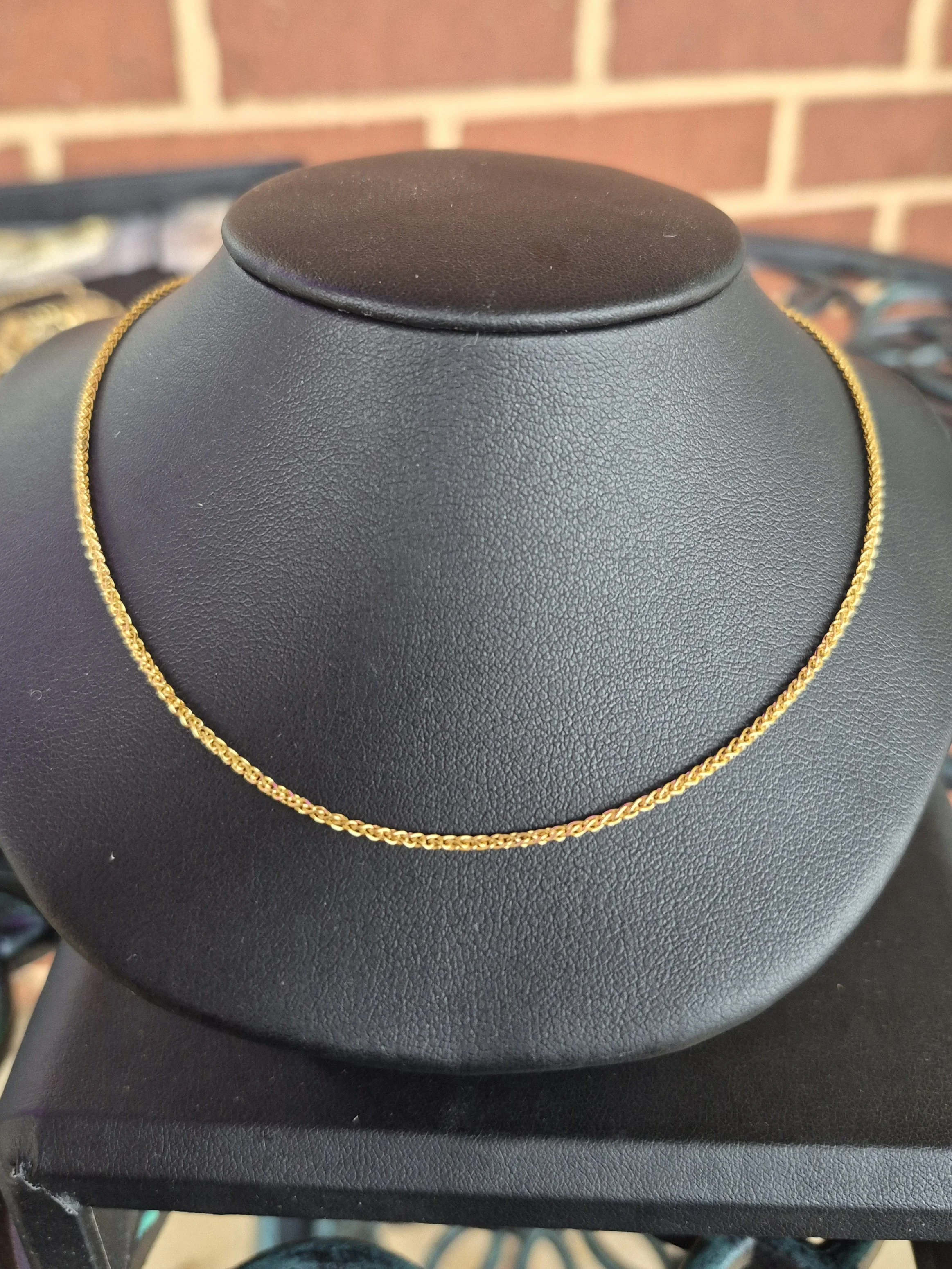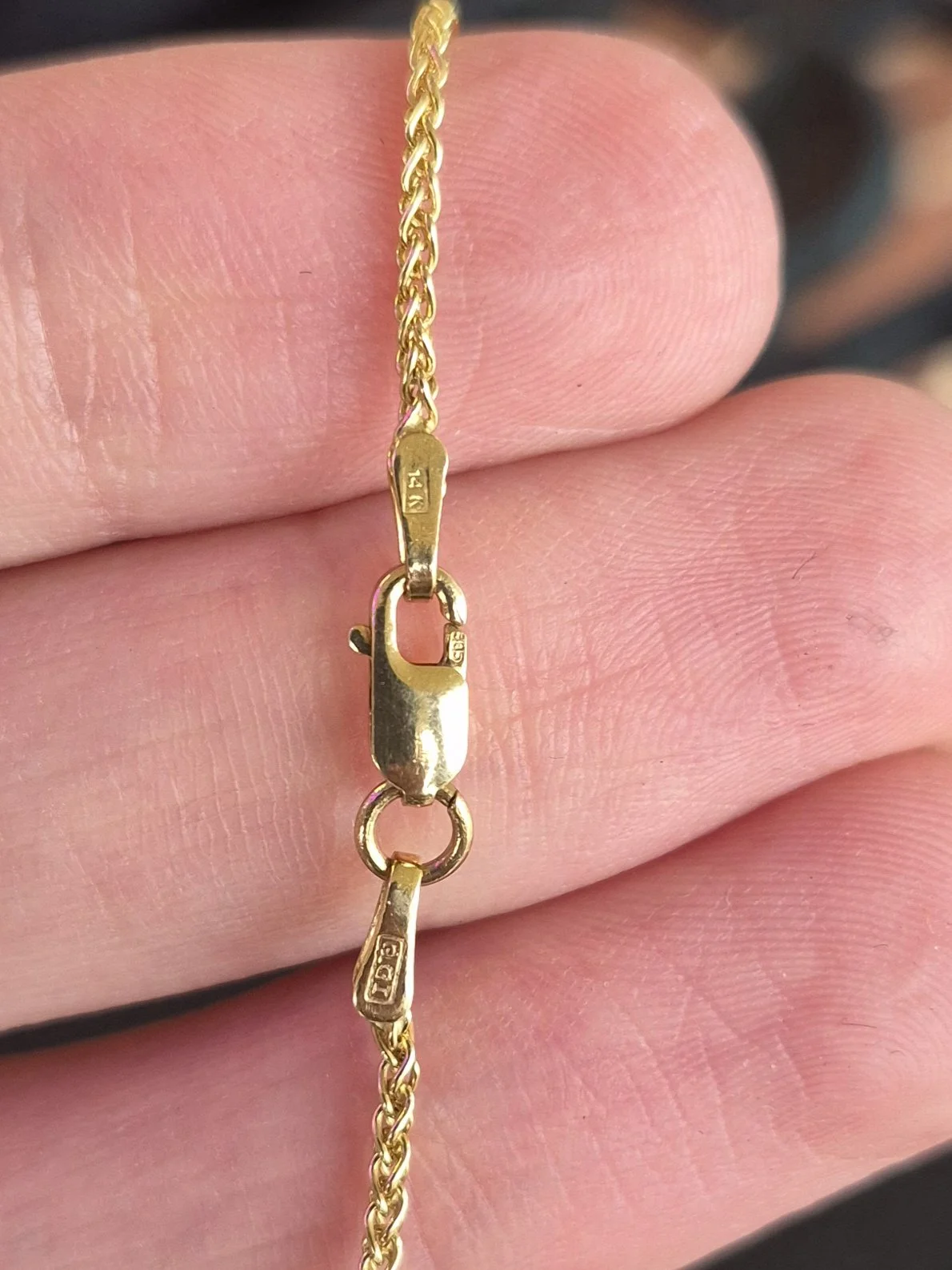 Image 1 of 4 Image 2 of 4 Image 3 of 4 Image 4 of 4 14k 4.3g wheat chain- 20" $404.00 1.4mm wide, 20 inches long Add To Cart Added! 1.4mm wide, 20 inches long Reviews Reviewer Name Review Date Star Rating Description Posted on Etsy Product Show More