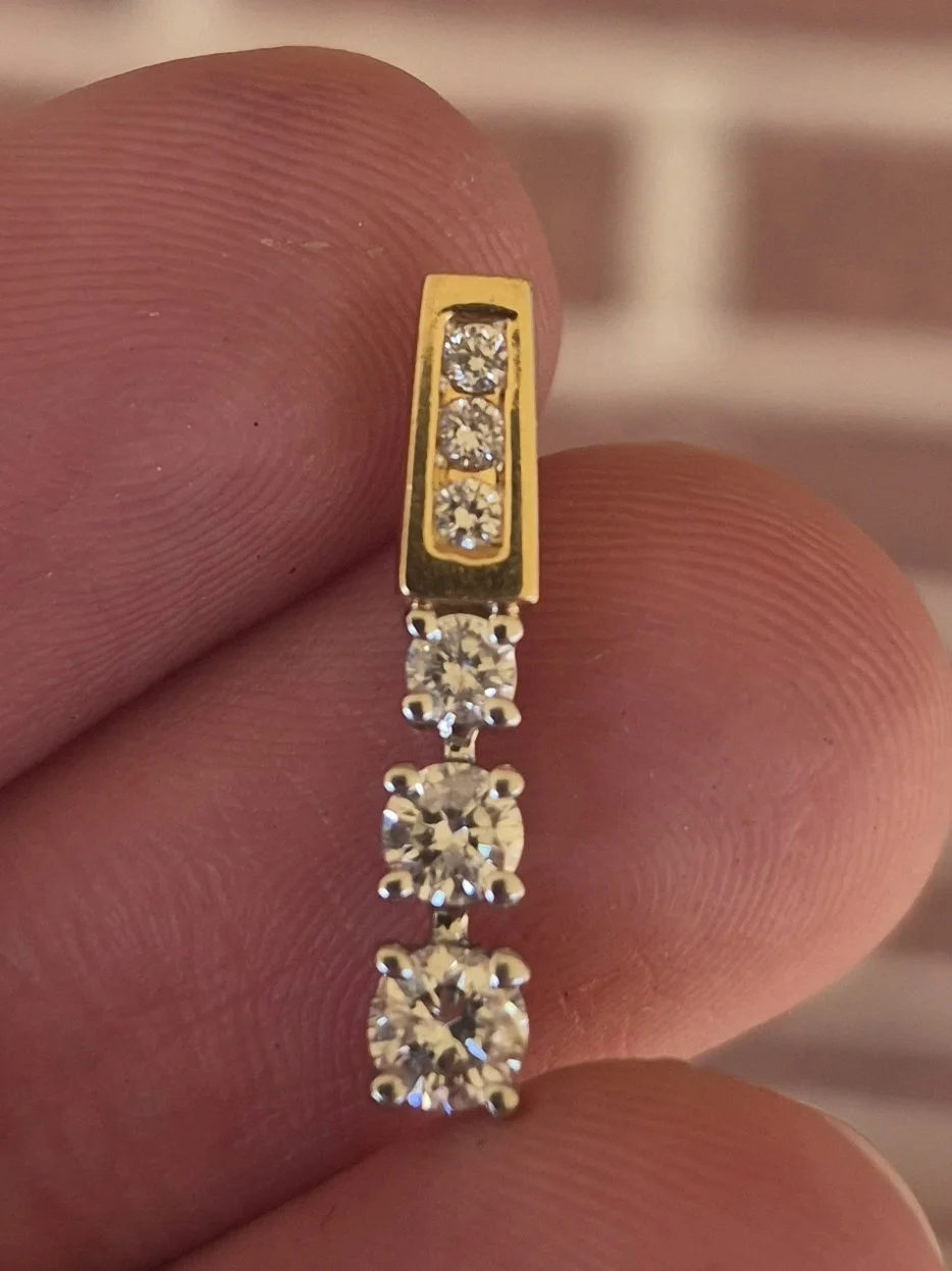 Image 1 of 4 Image 2 of 4 Image 3 of 4 Image 4 of 4 14k 1.5g two-tone diamond pendant $160.00 Yellow and white gold pendant with natural diamonds, 1.5mm bail Add To Cart Added! Yellow and white gold pendant with natural diamonds, 1.5mm bail Reviews Reviewer Name Review Date Star Rating Description Posted on Etsy Product Show More
