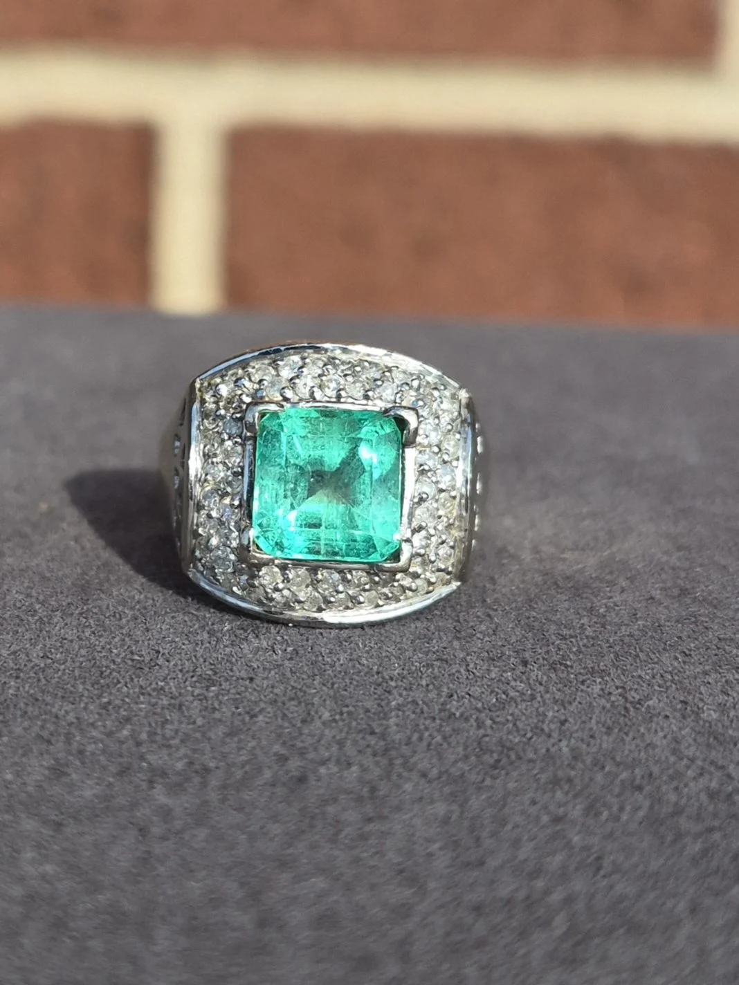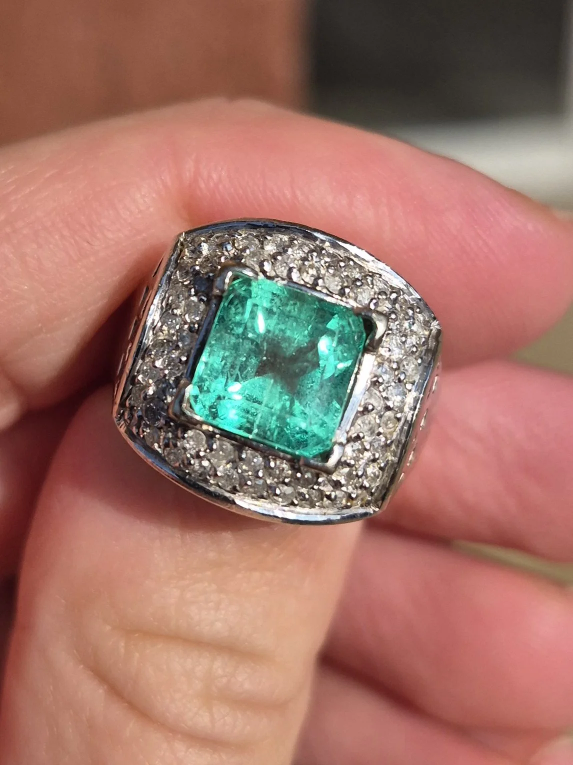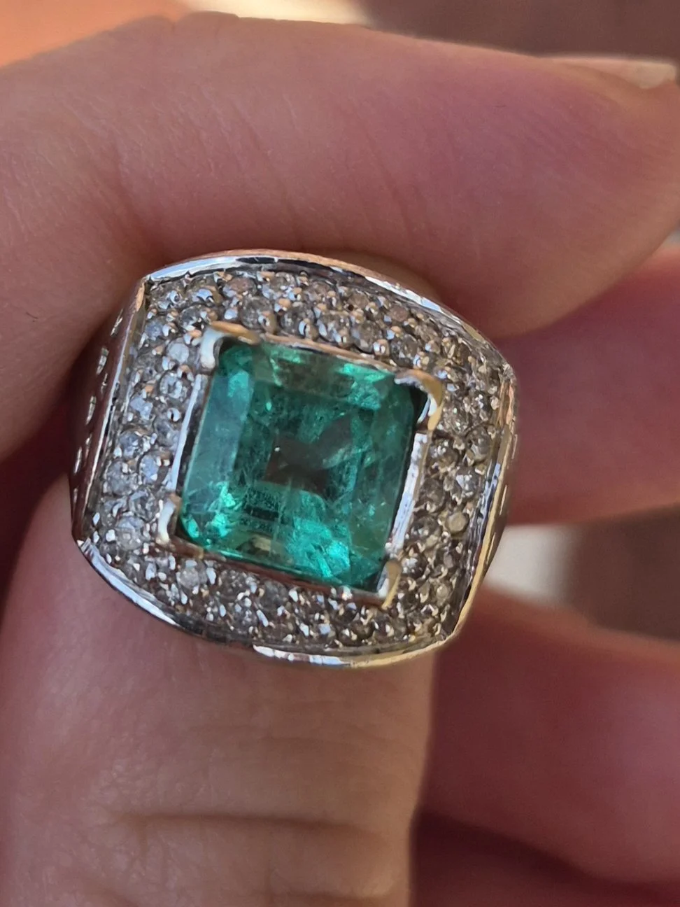 Emerald is approximately 3ct, square cut, moderately included, transparent, natural.