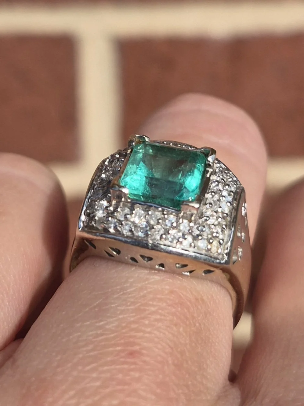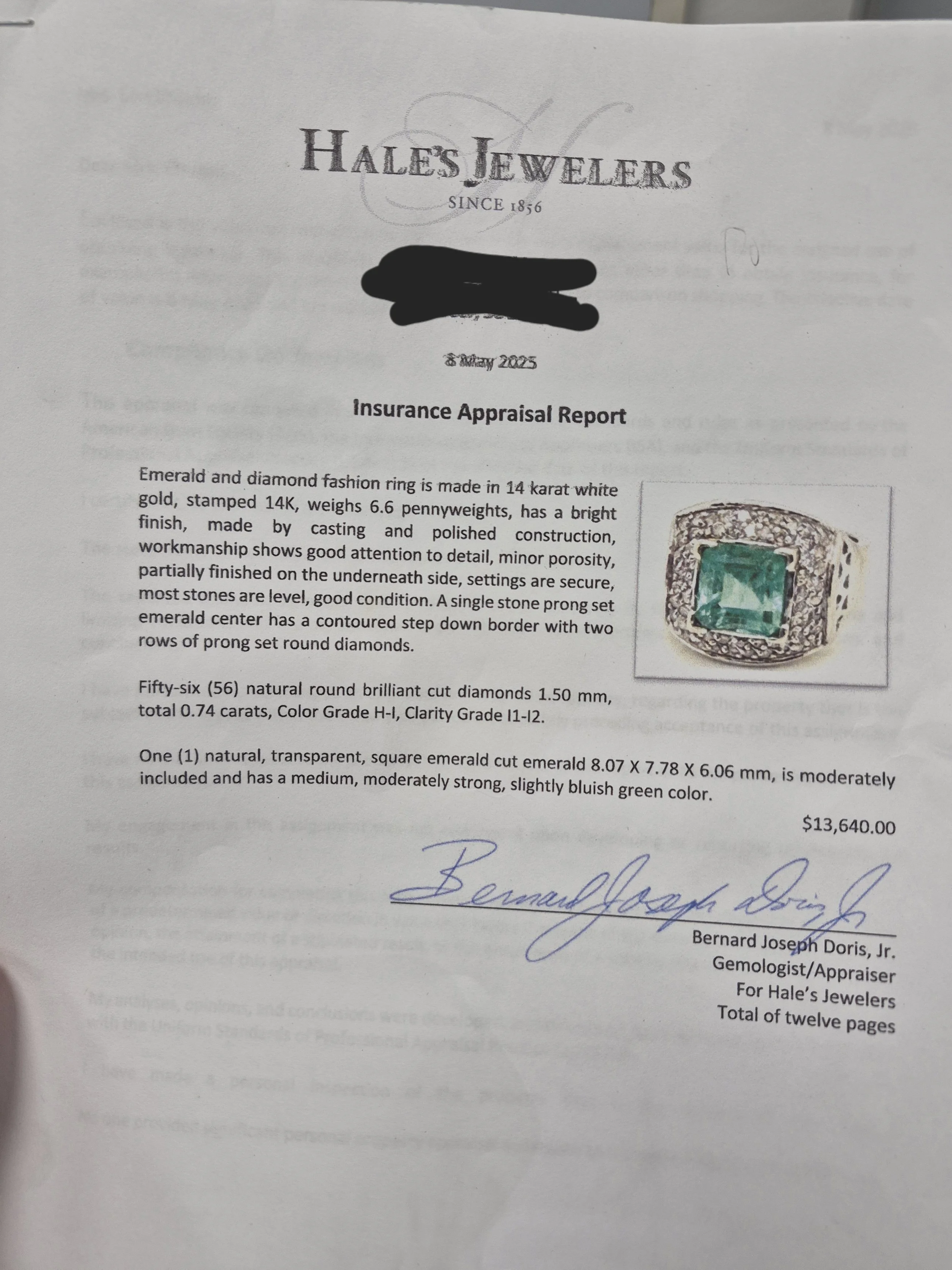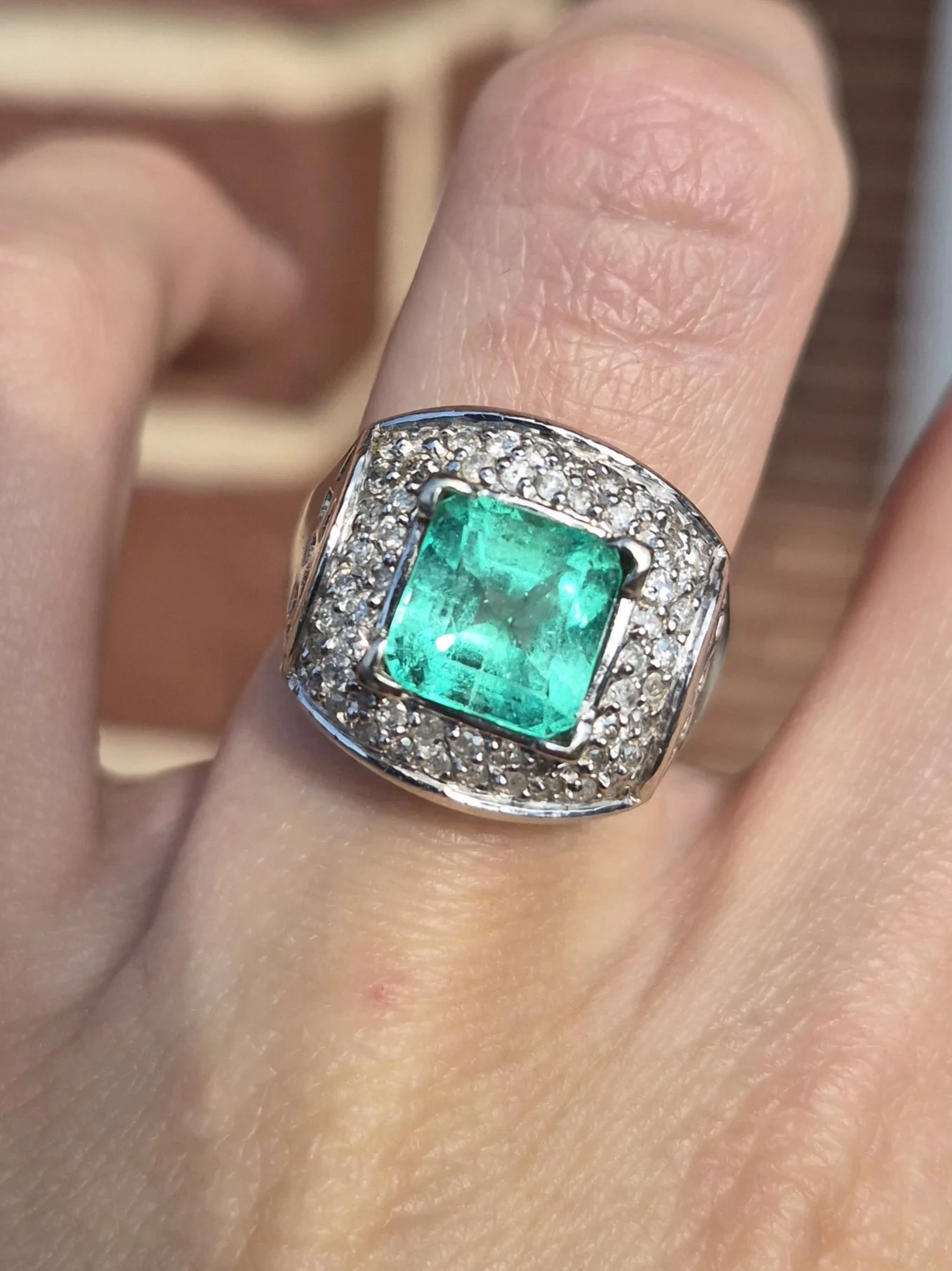 Emerald is approximately 3ct, square cut, moderately included, transparent, natural.