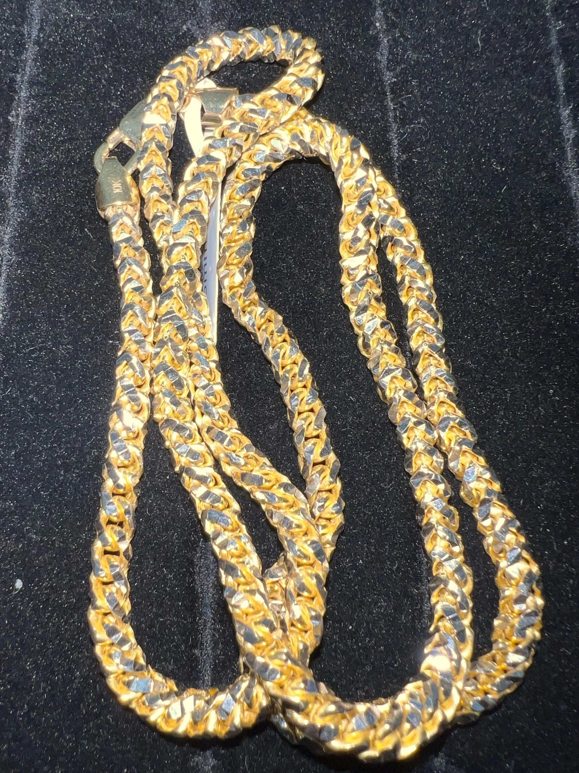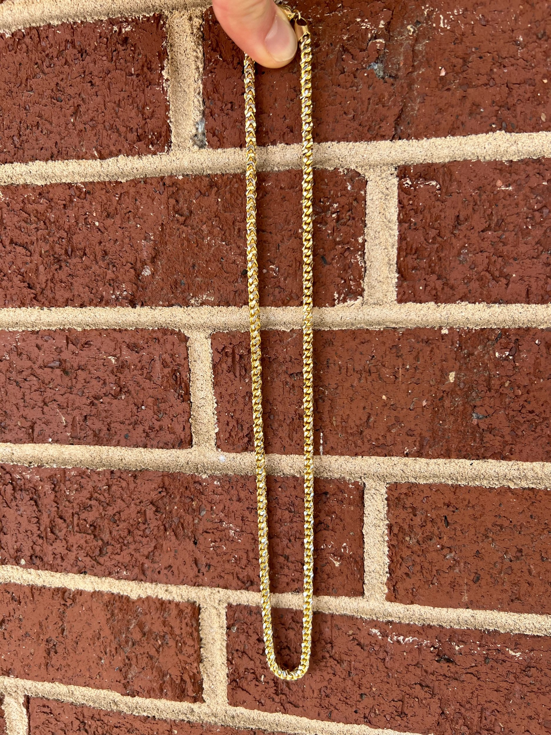 Image 1 of 5 Image 2 of 5 Image 3 of 5 Image 4 of 5 Image 5 of 5 10k 64.5g Franco Chain Diamond Cut 4.65mm 24" $4,386.00 Unique diamond cut Franco chain. Brilliant two-tone and heavy chain. Add To Cart Added! Unique diamond cut Franco chain. Brilliant two-tone and heavy chain. Reviews Reviewer Name Review Date Star Rating Description Posted on Etsy Product Show More
